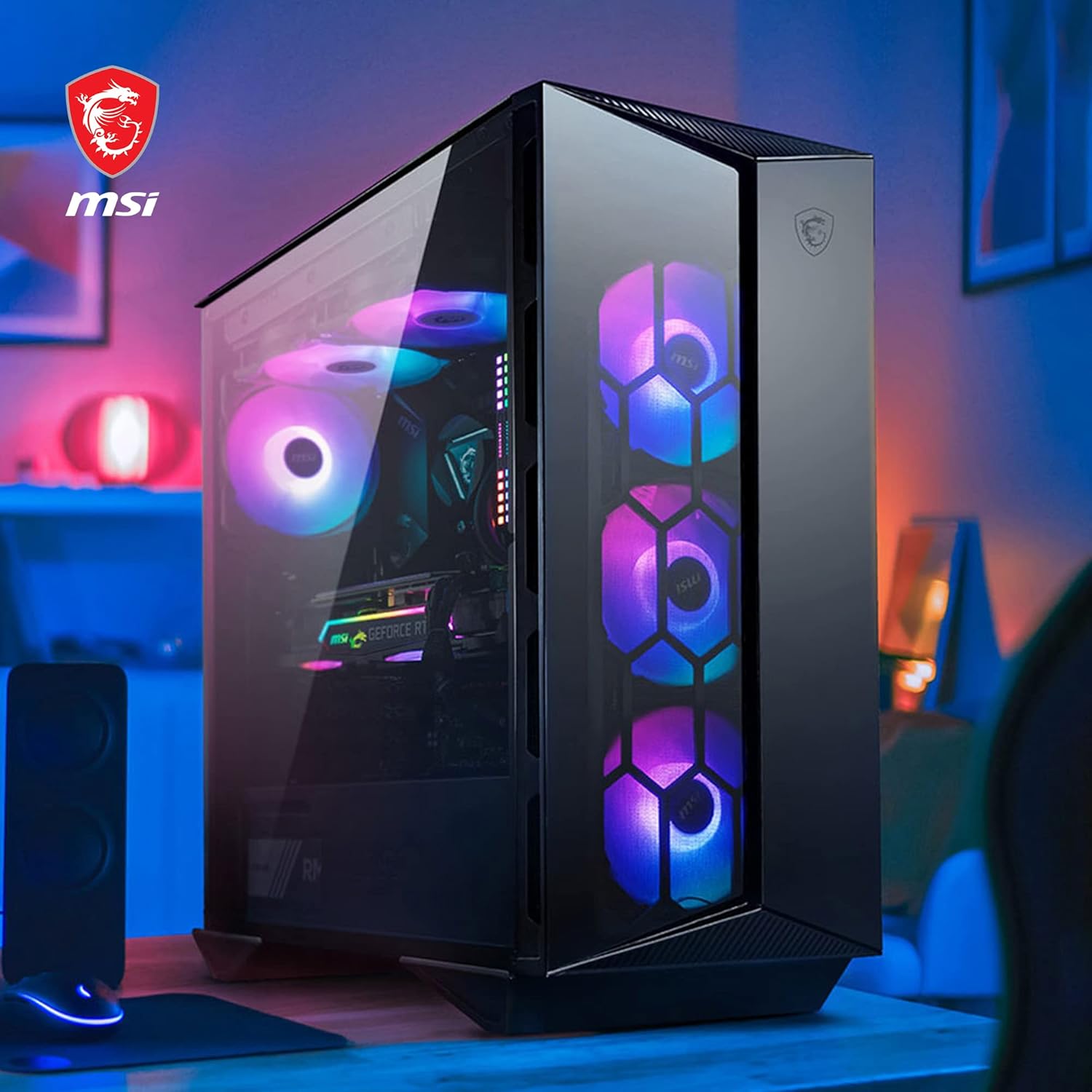 MPG GUNGNIR 110R PC Case: An Eternity of Excellence With its tempered glass side & front panels and spacious interior, the MPG GUNGNIR 110R mid-tower gaming PC case is an excellent choice for system builders looking to create a high-volume airflow ARGB showpiece with ATX motherboard support. A glass front panel displays triple 120mm ARGB intake fans behind a honeycomb dust filter. The intake fans along with a 120mm ARGB exhaust fan at the rear ensures that internal components receive ample cooling. An included 1-to-6 ARGB hub supports 26 lighting effects & further customization with Mystic Light. The top panel comes with a large magnetic dust filter for easy maintenance. A 4mm tempered-glass side panel enables full display of system components. The interior can support ATX, micro-ATX & mini-ITX sized motherboards, CPU coolers up to 170mm in height, and graphics cards up to 340mm in length. The front panel can house up to 3 x 120mm fans or up to a 360mm radiator while the top panel can house up to 2 x 120mm fans or up to a 240mm radiator. The rear supports a single 120mm fan or radiator. The top I/O panel at the front features a cyclable LED effects button, a USB 3.2 Gen 2x2 Type-C port (20Gbps), 2 x USB 3.2 Gen 1 Type-A ports (5Gbps) and mic/audio jacks.