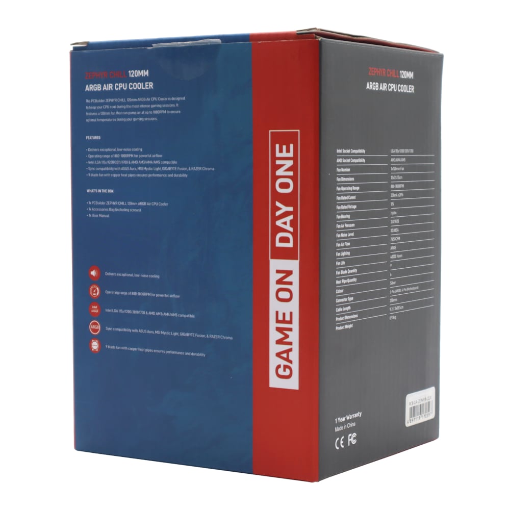 The PCBuilder ZEPHYR CHILL 120mm ARGB Air Cooler is designed to keep your PC cool during the most intense gaming sessions. It features a 120mm fan that can pump air at up to 1800RPM allowing your PC to maintain optimal temperatures during extended sessions.