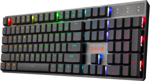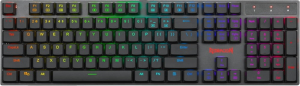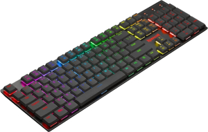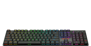 - Blue Switch, Ultra-Low Profile - N-Key Rollover - 104 Detachable Keys - Super-Slim, Double-Shot Injection Keycaps - RGB LED-Backlit - Metal Top Plate - Splash Resistant